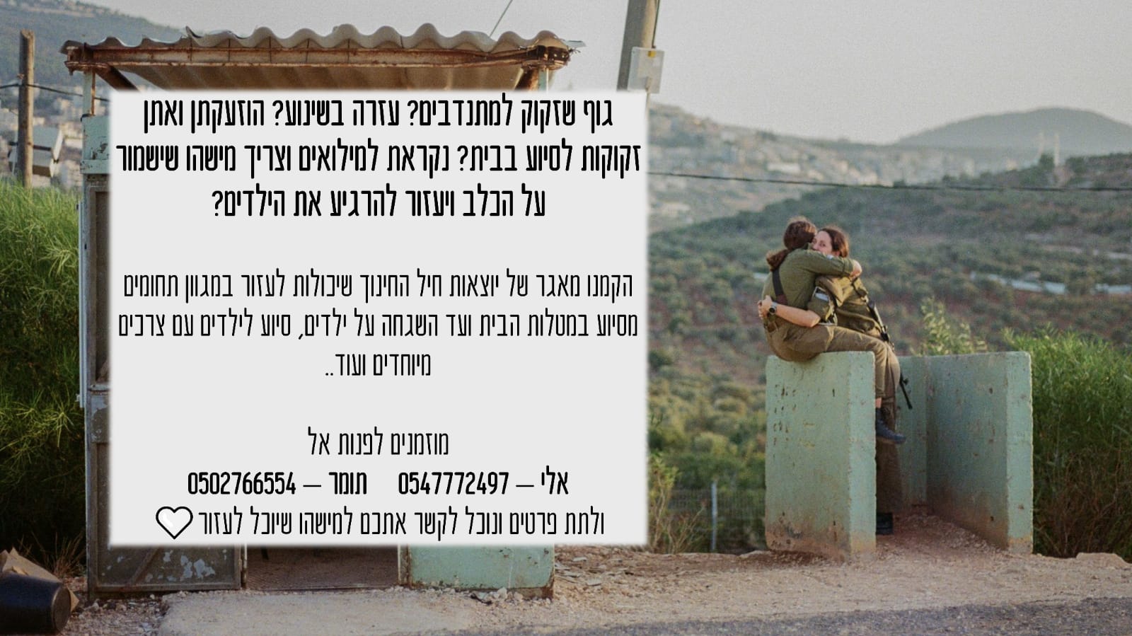 צריכים בייביסיטר? שירותי קניות? תמיכה רגשית? טיול לגינה עם הילד? המתנדבים שלנו כאן עבורכם, לפנייה כנסו לטופס: https://gforms.app/0xvRMix