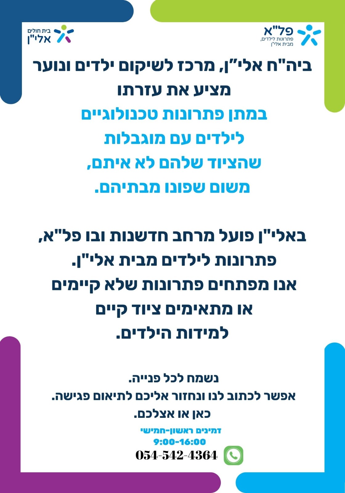 בית החולים אלי"ן, מרכז לשיקום ונוער-פתרונות טכנולוגיים לילדים מבית אלי"ן לילדים עם מוגבלות חסרי ציוד שפונו מביתם