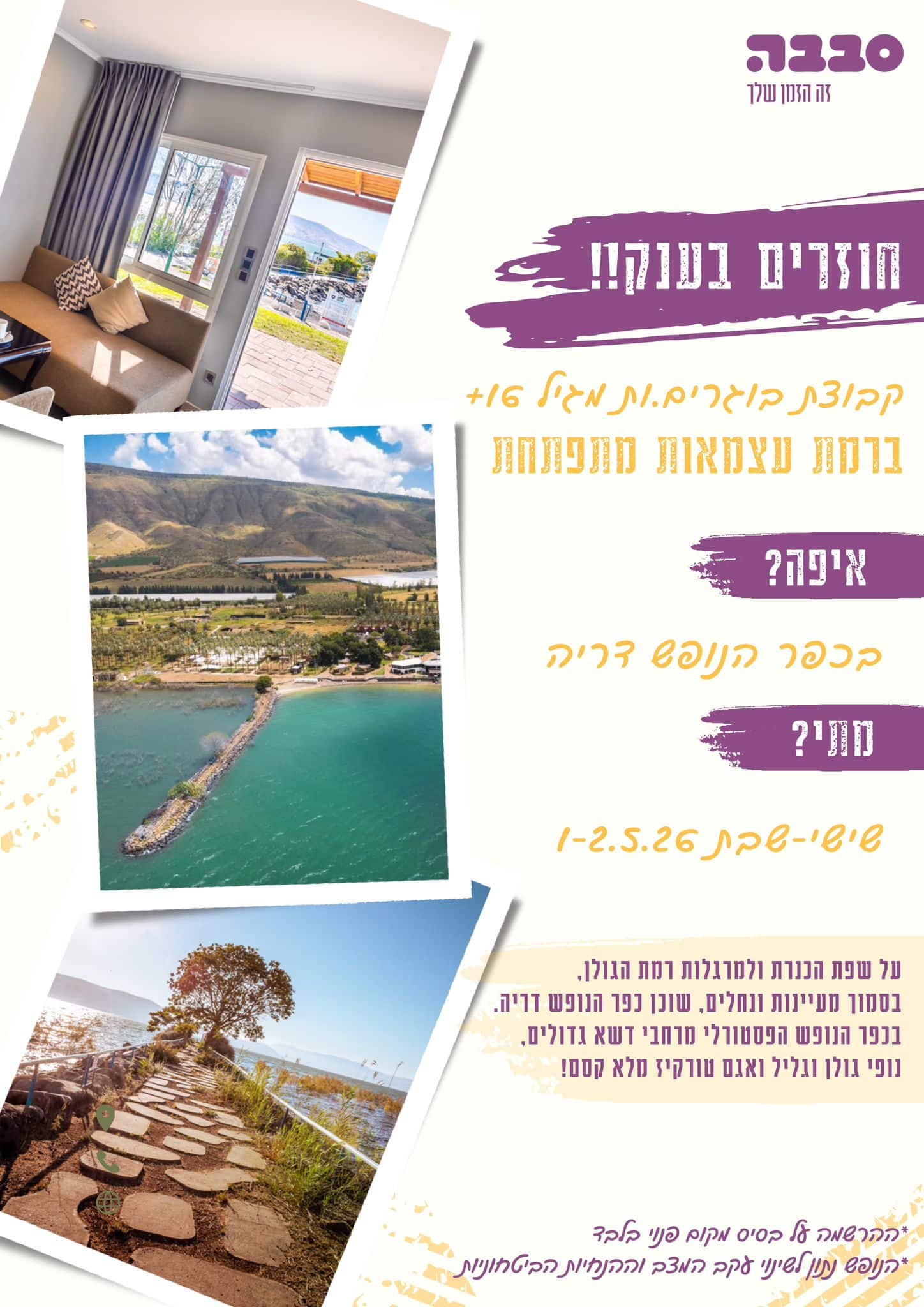 הגיע הזמן לקצת שקט, נוף לכנרת ואווירה של חופש אמיתי. אנחנו מזמינים אתכם להצטרף אלינו לנופש בכפר הנופש דריה, הממוקם ממש על קו המים למרגלות רמת הגולן.